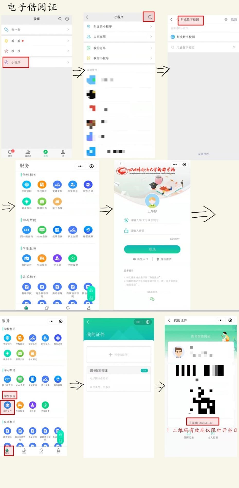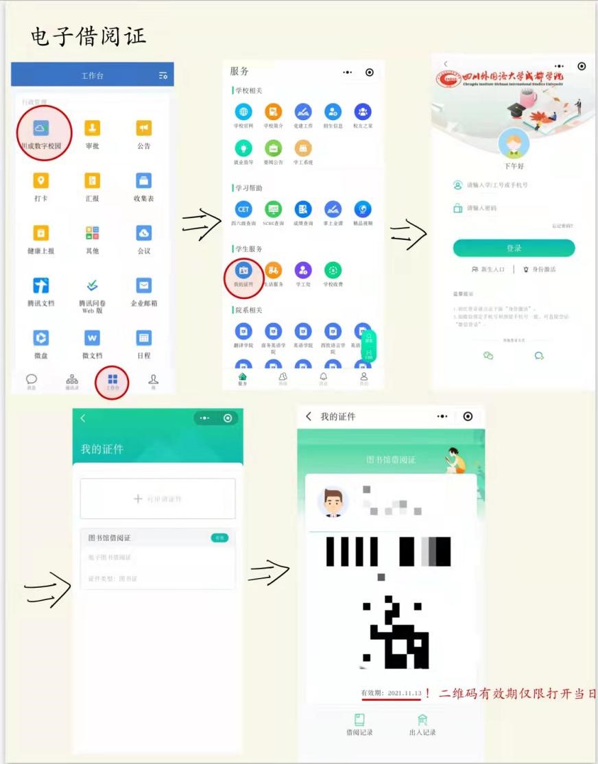打开企业微信——进入工作台——川外数字校园——进入登陆页面——学生服务——我的证件——图书馆借阅证